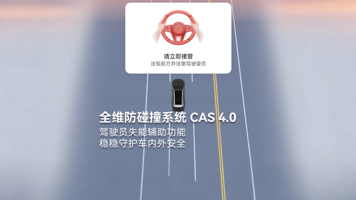 在官方演示画面中,当系统通过DMS驾驶员监测系统检测到驾驶员双眼长时间闭合等失能特征时,车辆首先出现轻微车道偏离,CAS4.0立即启动横向纠偏将车辆拉回正轨,并同步弹出视觉提示。